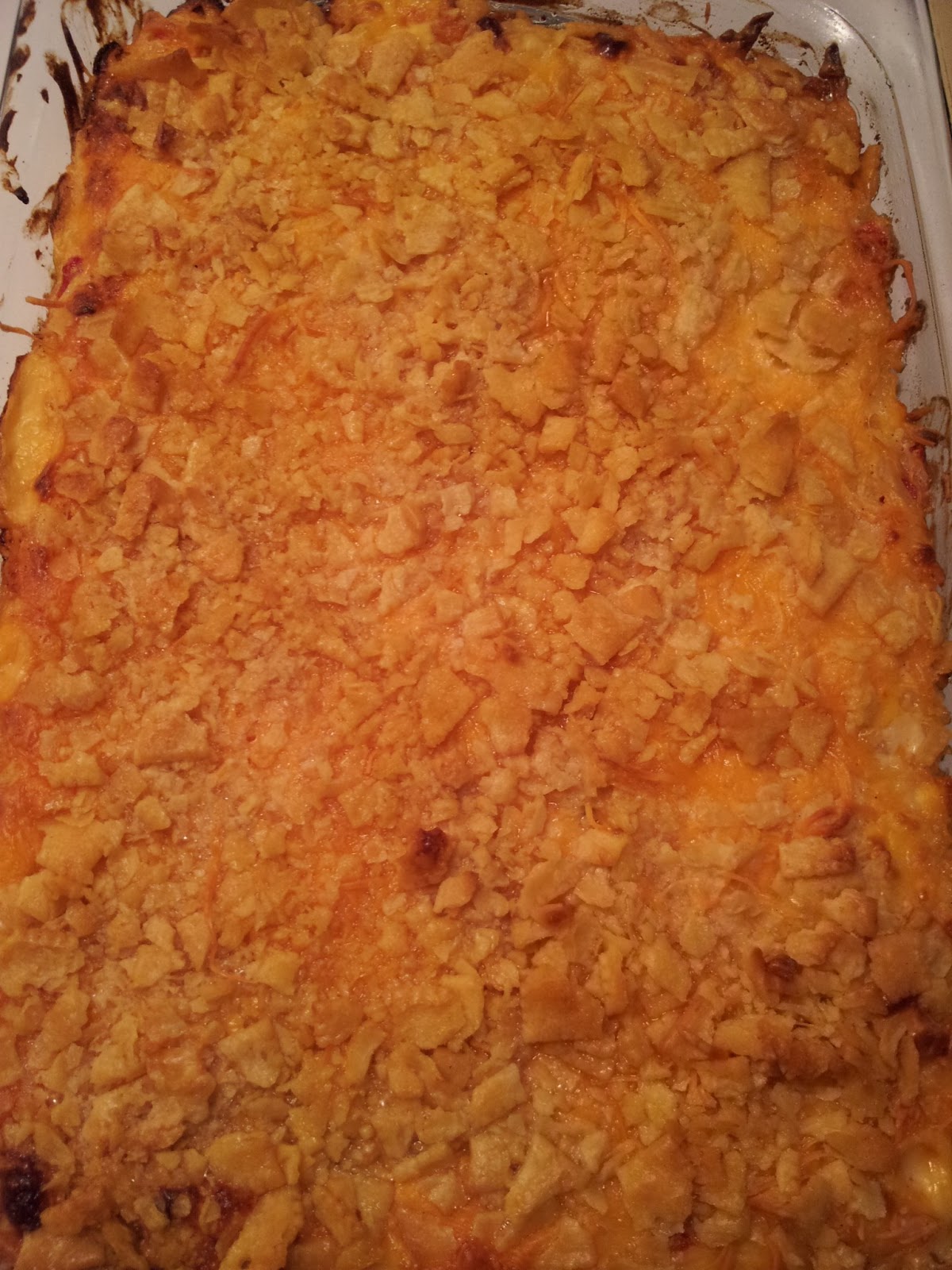 Sprinkle shredded cheddar on top, then the crushed cheezits, then arrange pieces of butter on top.