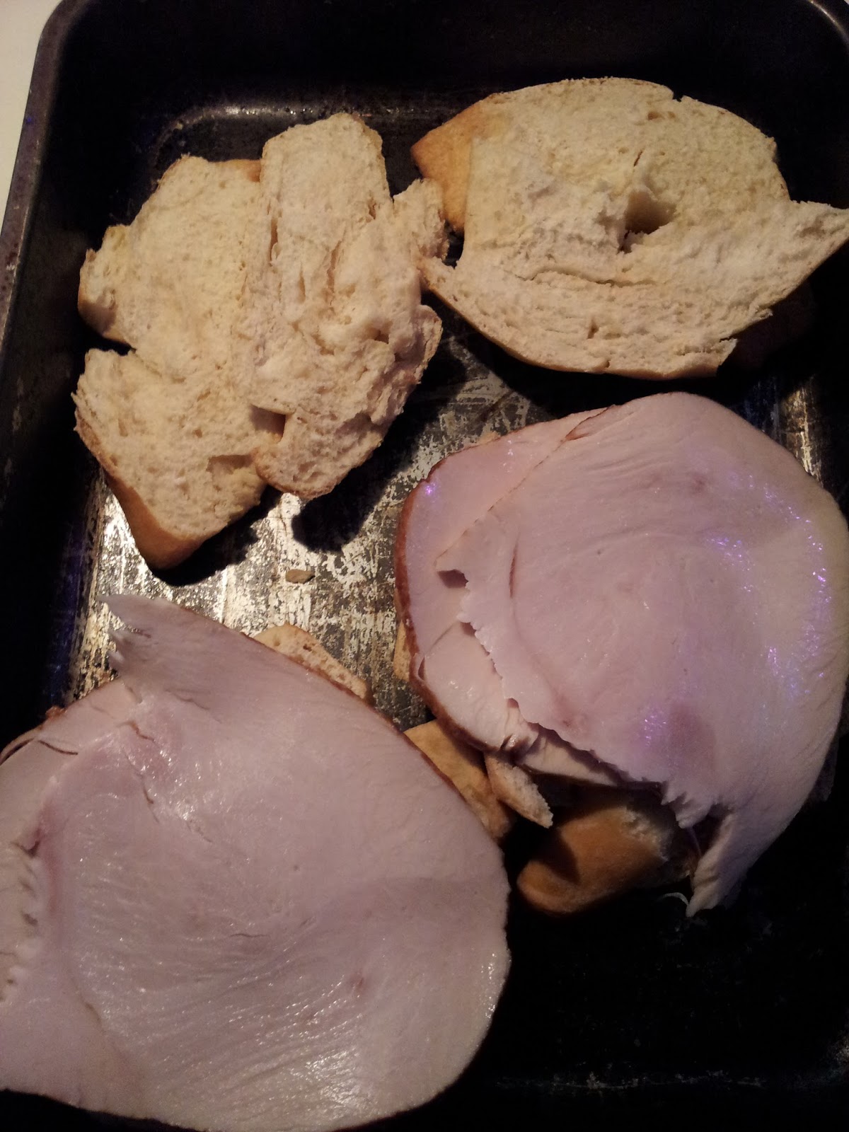 note**for the bread I used a tube of Pillsbury Grands crescent rolls; the tube makes 8 rolls but I used the whole tube to make 4 larger rolls (for each roll I pressed together 2 triangles & rolled up). After baking I split each roll in half lengthwise (like butterflying it) and then layered the toppings.